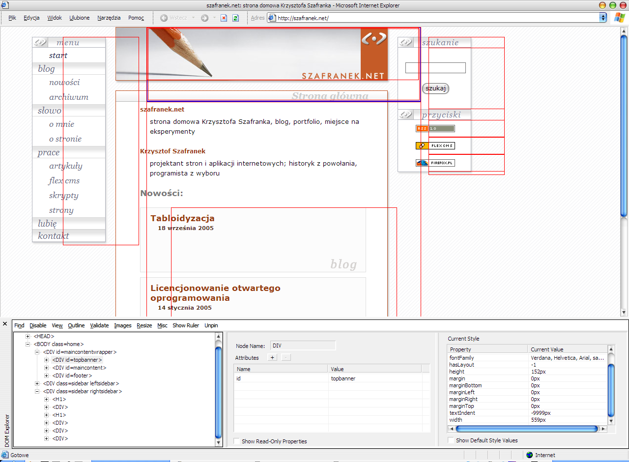 Chyba nie trzeba dodawać, że opisywane narzędzie, podobnie jak “rewolucyjne” nowości zapowiadane w IE 7, są próbą dogonienia Firefoksa. Funkcjonalność microsoftowego DT łączy w sobie to, co można znaleźć w firefoksowym DOM Inspectorze oraz rozszerzeniu Webdevoloper Toolbar. Mamy więc m.in. możliwość wyświetlenia drzewa DOM dokumentu, obramowań wokół elementów blokowych, atrybutów i właściwości CSS. Do tego dostęp do walidatorów, czyszczenie pamięci podręcznej i ciastek, zmiana rozmiaru okna. Ilość dostępnych funkcji jest zauważalnie mniejsza niż w odpowiedniku dla Firefoksa. Mi osobiście najbardziej brakuje informacji o lokalizacji każdej reguły CSS, obecnej w DOM Inspectorze. Jest to przydatne, gdy strona korzysta z kilku arkuszy stylów i należy ustalić, skąd pochodzi jakaś konkretna właściwość. Oglądając własną stronę, udało mi się znaleźć błąd w programie: nieprawidłowo wyświetla obramowania wokół DIV-ów. Jest to oczywiście dowód na techniczne wyrafinowanie mojego bloga :).