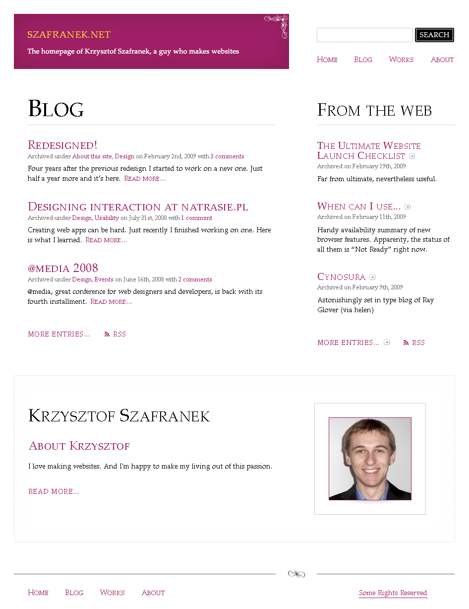 I decided to build the whole design upon a single typeface, Palatino. I used rich typography, including big headers. The results look great on Mac OS X. When the design had been completed and almost all the code had been written, I checked how did it look on Windows XP. It was a terrifying experience. Just look at the screenshots. When compared to the full, smooth shapes on OSX, glyphs on Windows look like an anorectic abomination.