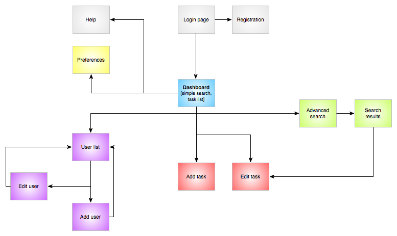 I approach this analysis by drawing a user page flow. This simple diagram shows what screens the application needs to have to satisfy all the tasks a user can perform, from start to finish.