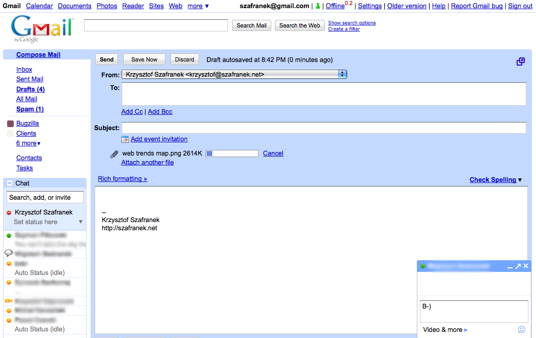 If 2Advanced.com was the example of a Flash site in 2001, Gmail is the example of how Flash can be used in 2009. If you check the HTTP traffic on Gmail, you’ll notice few SWF files. They’re used there to play sounds in chat, support video and display upload progress. Unlike the artificial, hi-tech interface of 2Advanced.com, Gmails feels like a normal web page. Flash is entirely transparent to the user and augments, not replaces, core elements built with HTML, JavaScript and CSS.